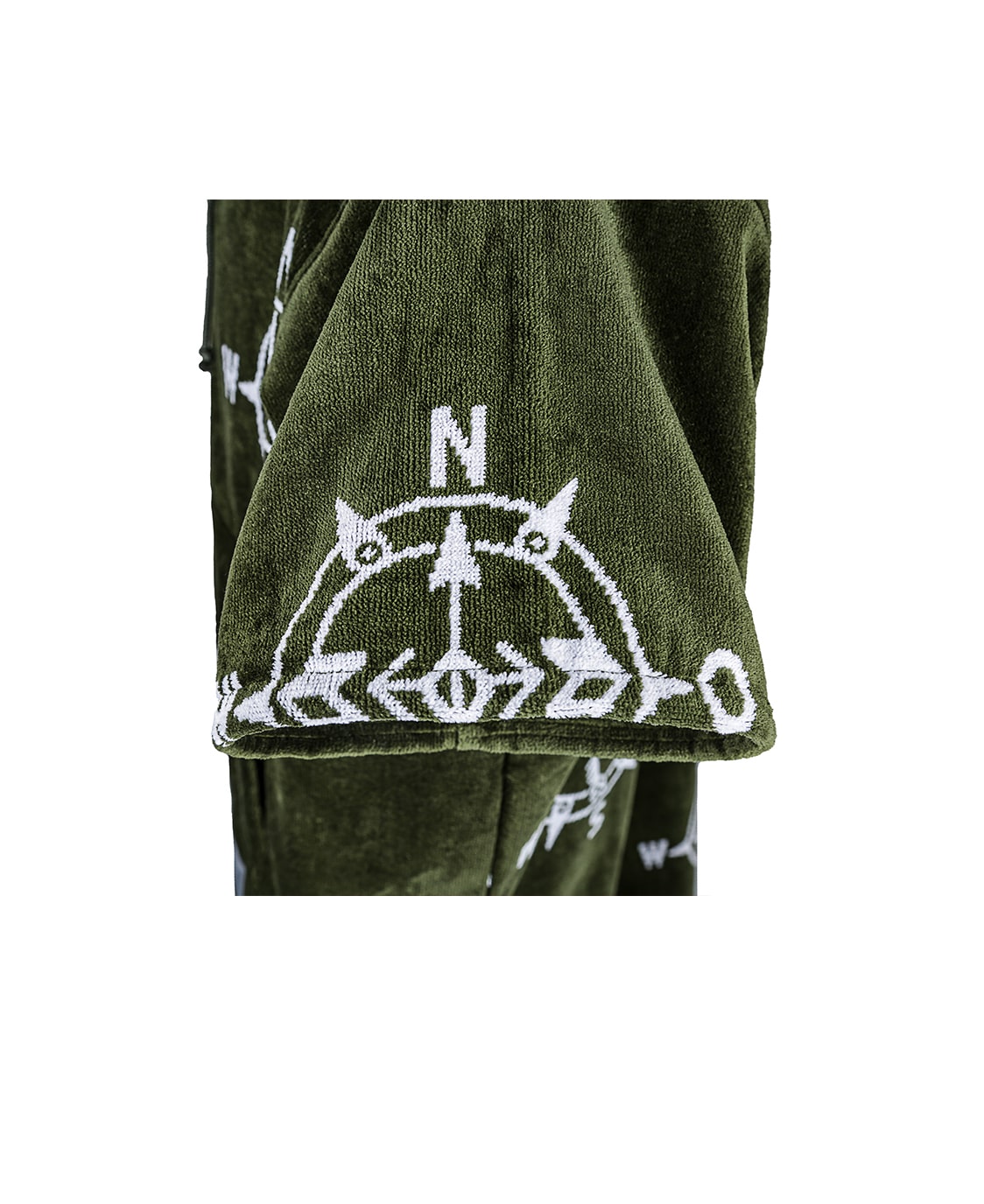 Die Special Edition im Compass-Allover-Muster in Olive / White wird als Velours produziert. Das Material der Ponchos erhält damit ganz besonders starke und leuchtende Farben. Noch dazu bietet der Baumwollstoff so den Vorteil einer leichten Handhabung. Der Kragen ist etwas höher geschnitten und die Kapuze kann über die Kordel fest zugezogen werden. So bleibt der Wind und die Kälte draußen und unter Deinem Poncho wird es noch kuscheliger.